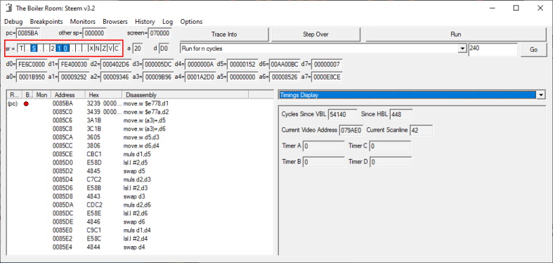 Leonard/Oxygene gave me the idea that executing a STOP instruction before each MULS/DIVS might be able to fix the flickery rasters, at the expensive of taking more time to precalculate each waveform. This trick is actually attributed to Ziggy Stardust and is a simple, brilliant idea.