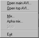 Alpha - displays the output file selector and AVI compression codec dialog then starts mixing with optional transparency,