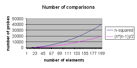 This graph compares n-squared with (n*(n-1))/2. This algorithm requires far fewer probes and