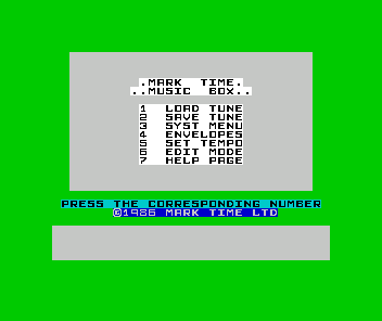 Tunes compiled using Music Box and saved to disk. The loader contains a menu to play them.
