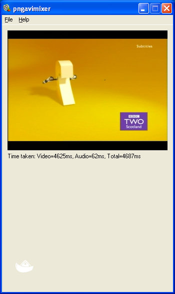 In this example a 13 second 320*240 uncompressed AVI BBC2 ident was mixed with a transparent png logo.