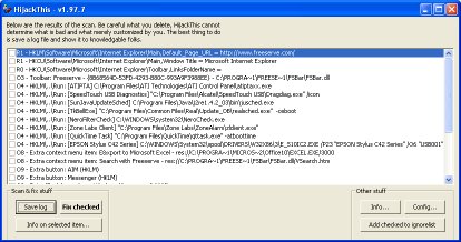 If there are any suspicious items listed such as services or programs which should not be there, and are not recognised system objects then tick them and press "Fix checked" to allow HijackThis to remove the item.